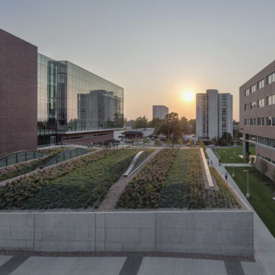 Multiple award winning landscape that includes an intensive green roof, urban streetscape and campus amenity spaces.